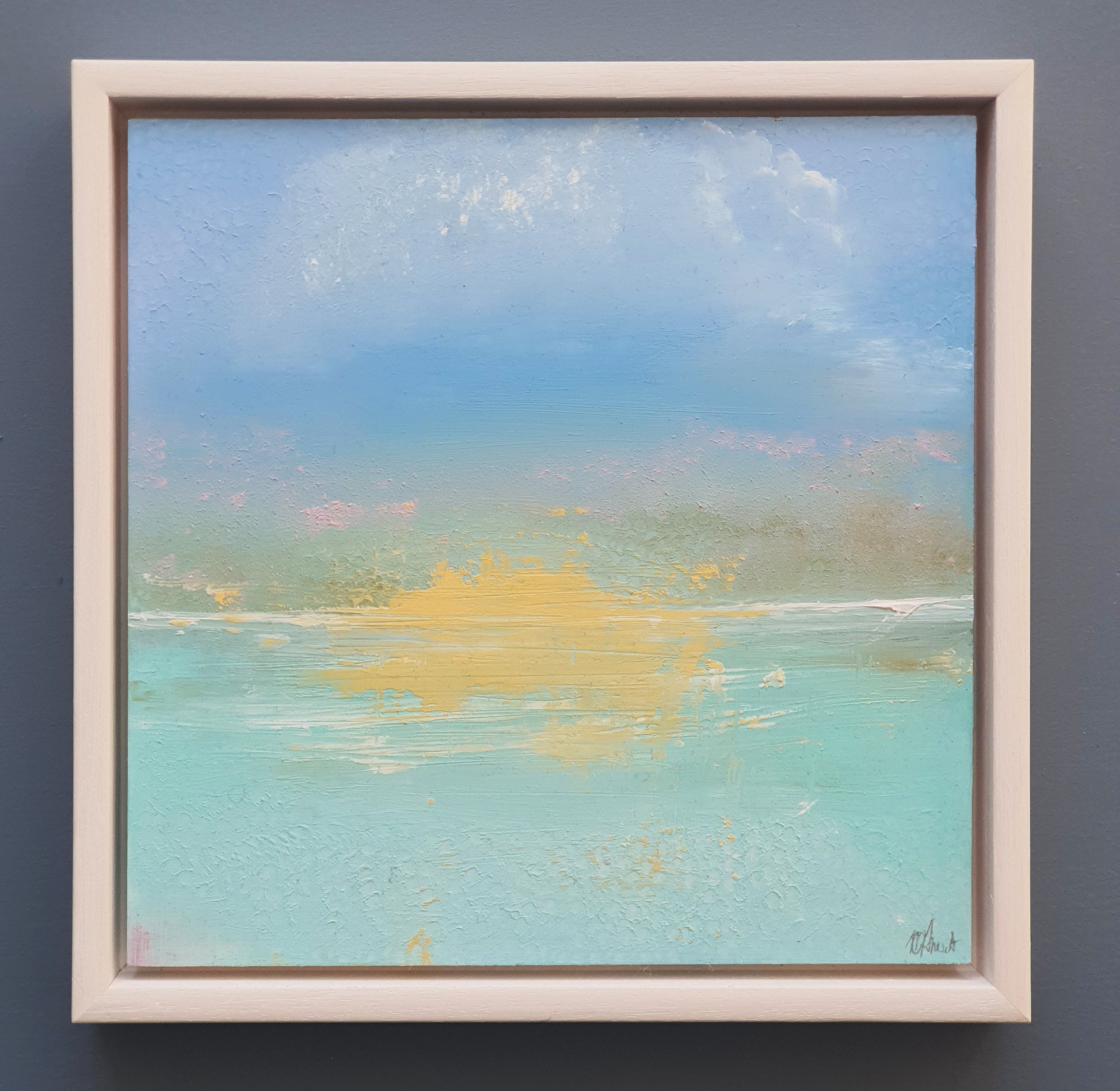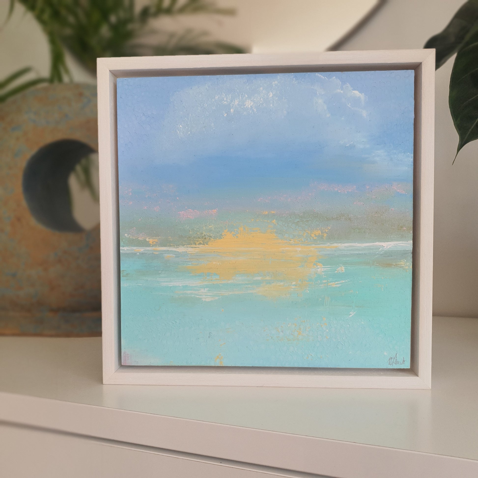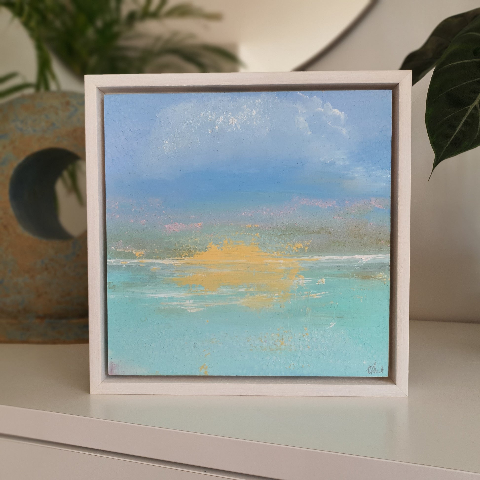 An original oil on board, elegantly framed in a modern white wooden floating frame.A gentle evocation of renewal and clarity, suggesting the quiet unfolding of light and life.
