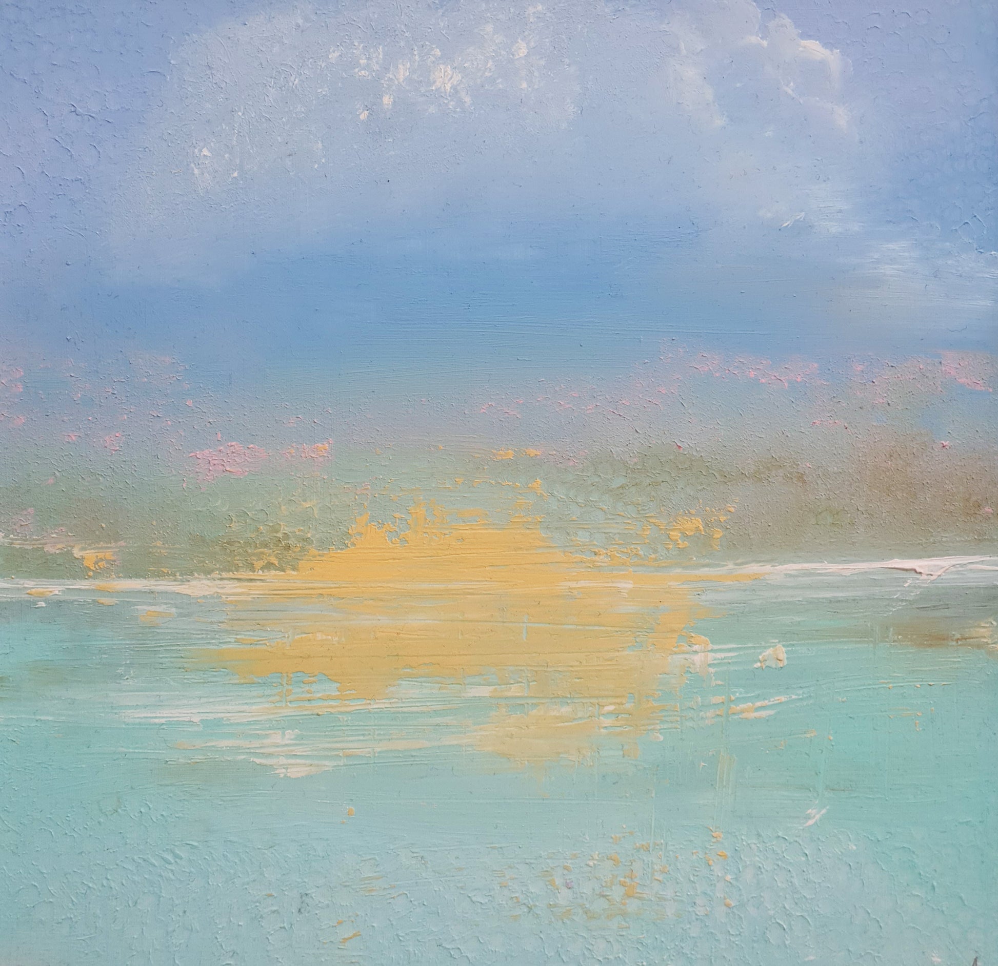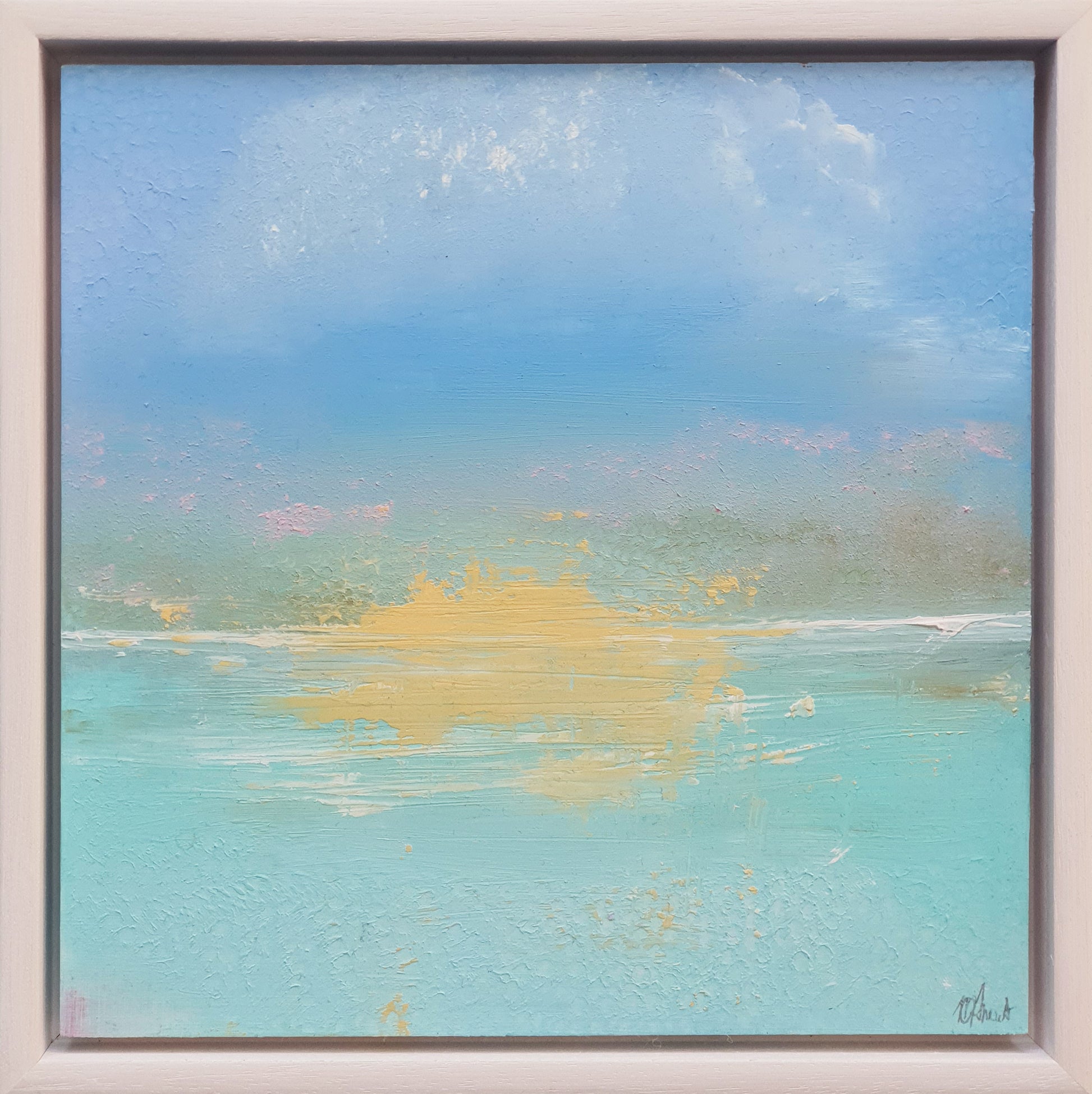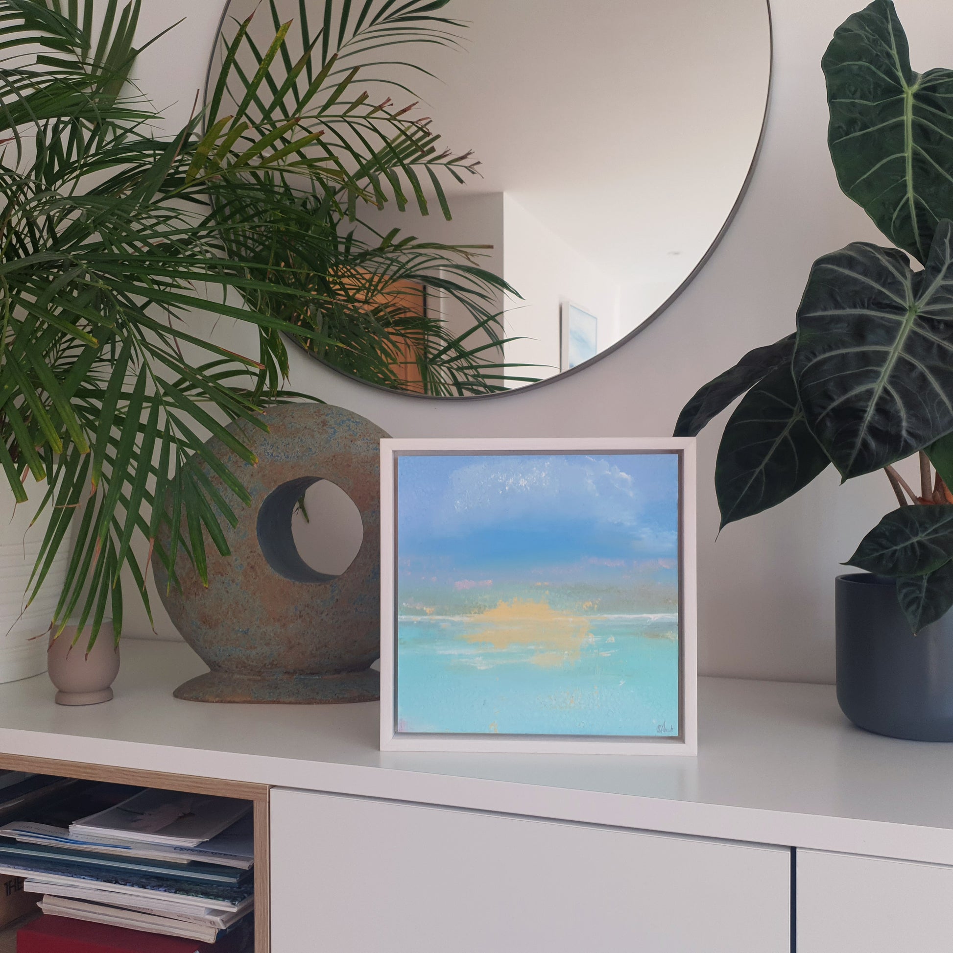 An original oil on board, elegantly framed in a modern white wooden floating frame.A gentle evocation of renewal and clarity, suggesting the quiet unfolding of light and life.