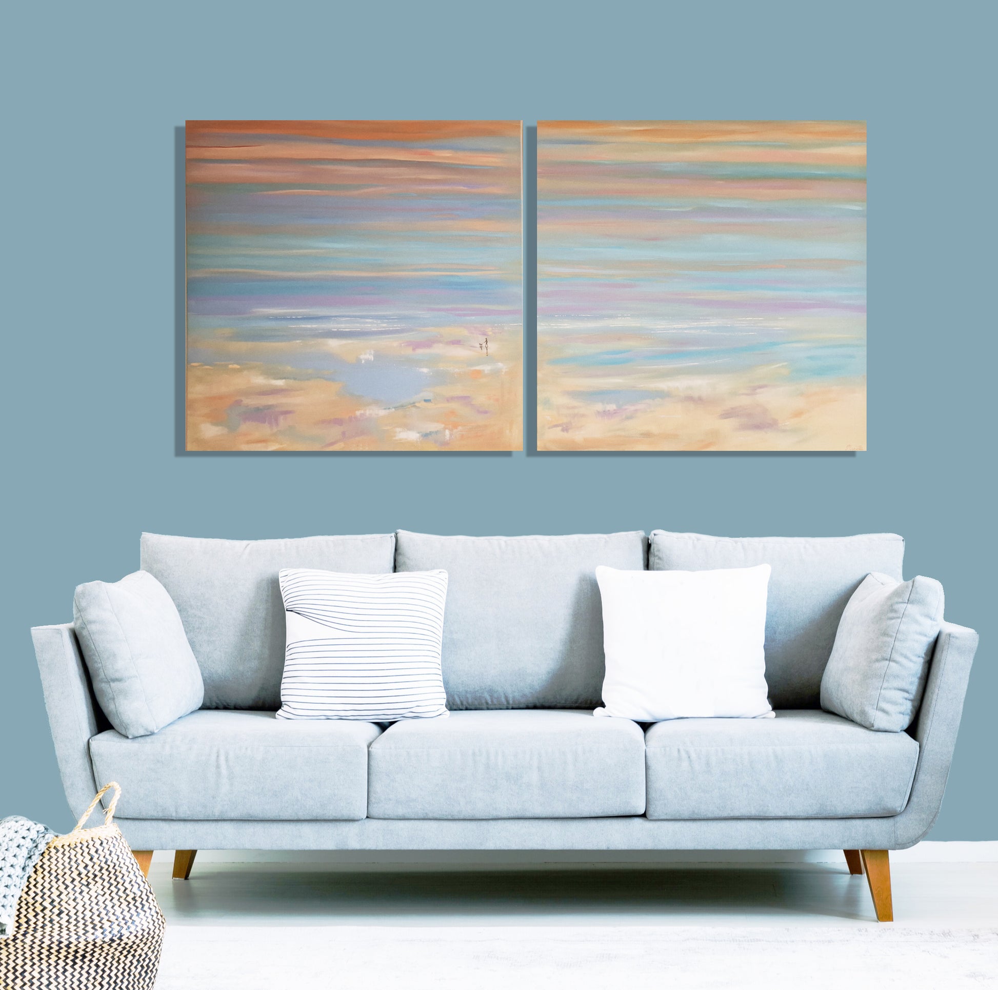 A diptych in oil on canvas, capturing the warmth of a summer evening. Soft hues and gentle light create a sense of tranquility and nostalgia, evoking the peaceful beauty of a sunset. A solitary figure walks along the shore with their dog, adding a quiet, contemplative presence to the scene.